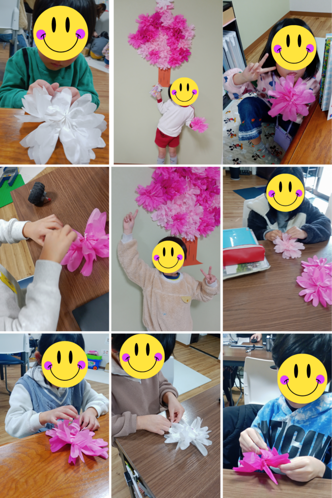 パズルでは一足早く お部屋に桜を咲かせました!桜の形に切ったペーパーフラワーを、そぉ~っと 1枚ずつはがしていきます🌸みんな手先を上手に使って丁寧に、そしてとっても綺麗に作ってくれました👌