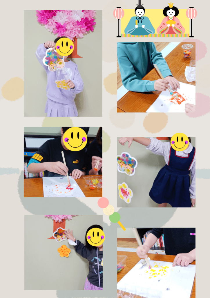 お雛様とお内裏様のお顔を描いたり、折り紙の着物を着せたり、それぞれ個性あふれる作品に仕上がりました。下飾りには桃の花をイメージしながら、スポンジに絵の具を付けてポンポンッ!と色を付けました🥰