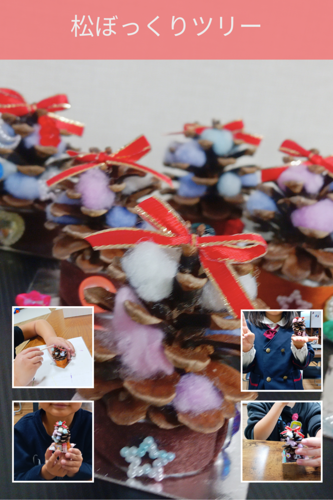 パズルでは今年最後の制作『松ぼっくりツリー🎄』を作りました。まずは松ぼっくり選びから😮大きいのを選ぶ子や、「小さくて可愛いのにする~♡」と言う子 それぞれ好みのを一つ選びました。