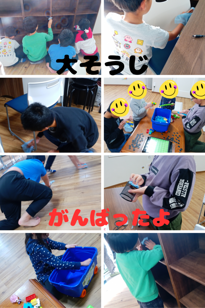 その姿に、スタッフ達もビックリ&感心しました。いつも使っている自分の席から始まり、おもちゃ棚、床の隅々まで、全てピカピカにしてくれました✨